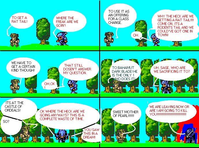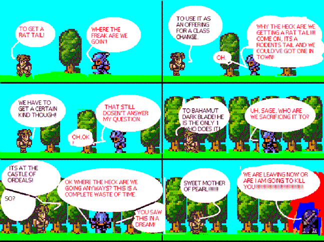 But for a first try, not bad. Try not to use the sprite bubbles so messy, and the crap is with that last panel? And finally, I think there's a thread for this kind of thing already, a stickied one. EDIT: Nope, no sticky, you did good to make your own post, never mind. XD |