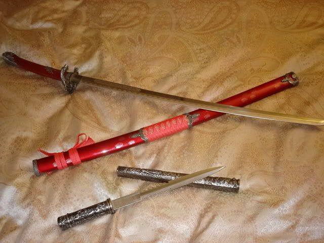 First katana I purchased, about 6 years ago now. http://i10.photobucket.com/albums/a1...irstkatana.jpg Second katana, I really like the wrapping and it's the one I would grab if a burglar showed up. Beside, my dull if pretty dagger. Note to self, do not attempt to shave with this one. http://i10.photobucket.com/albums/a1...ppedKatana.jpg Third and most recent katana. I wub it. Beside, my neat and stupidly sharp dagger. http://i10.photobucket.com/albums/a1...agonKatana.jpg Wizards, why did you abandon d20 Modern and your loyal customer? http://i10.photobucket.com/albums/a1...ModernLine.jpg |