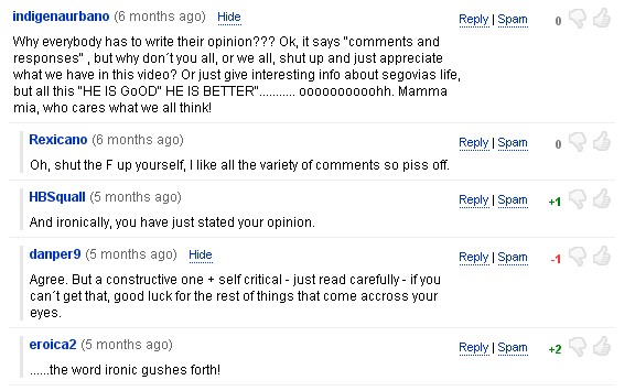 Funny story, I spent over six years in one prolonged Internet argument, once. There was a number of people all arguing that I was, variously, a waste of life, a failure, a shrimp farmer, a homosexual (oh, the horror), an attention whore, a generic whore, a deluded mythomaniac, a hypocrite, a drama queen, a pretentious pseudo-intellectual, a violation of natural law, a retard, a criminally stupid retard and a few more colorful things. Naturally, I argued that they were mistaken, which prompted more counter-arguments re. my grammar, sexual proclivities, hygiene, career prospects, face, mother and uncool inability to not care about things.