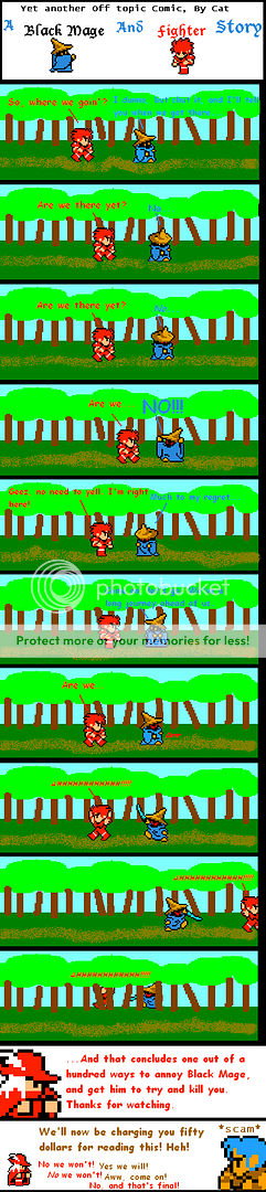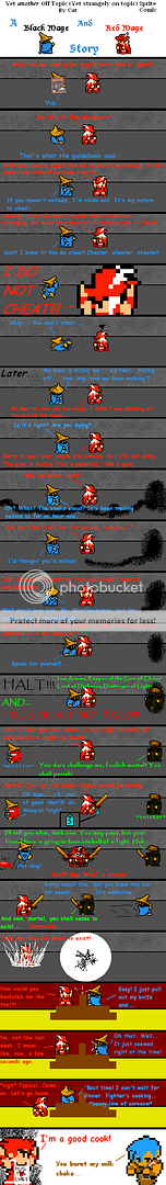 I like all the Characters pretty much equally. They flow together very well... or rather, conflict well. But out of the four... I like BM best. I dunno why... he's just so... himself. Hard to explain. I plan on using White Mage and Black Belt later as well. And I want to make one with Garland, but I'm lacking his sprites. I have some imps already. ^^ So, yes. Expect more. I just need the resources and the energy to put on together.. And I'll see how making the panels wider works for me. |