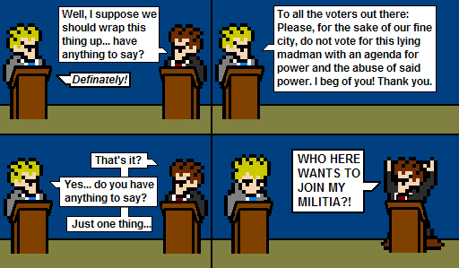I'm currently near the end of a three-hour break between classes on campus. During that time I decided to just do a little sprite comic strip about my politician character, ApathyMan. Here it is.