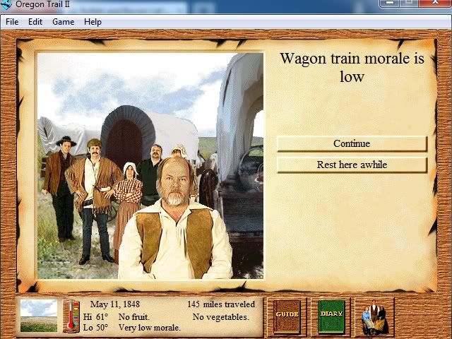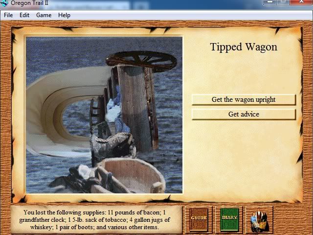 We made it about 120 miles out to St. Mary's Mission, a small merchant outpost. We restocked a bit on bacon and whiskey and I bought a blanket for horsecock. Also, bought candles for a candlelight vigil, should anyone of any importance actually die along the way. Welp, the Red Vermilion River. This one's a calm stream, only two feet deep. We shouldn't have as much trouble as... ![]() ... There goes another grandfather clock. The count's at 7. Also, the babies are soaked again. ![]() I wonder why. Couldn't be the dead body we threw overboard or the three times we've flipped the wagon. There is a real chance that rpg gets fired as trail guide if we don't slow up, which would end the game. I say we sit back, play some cards and rest a bit.